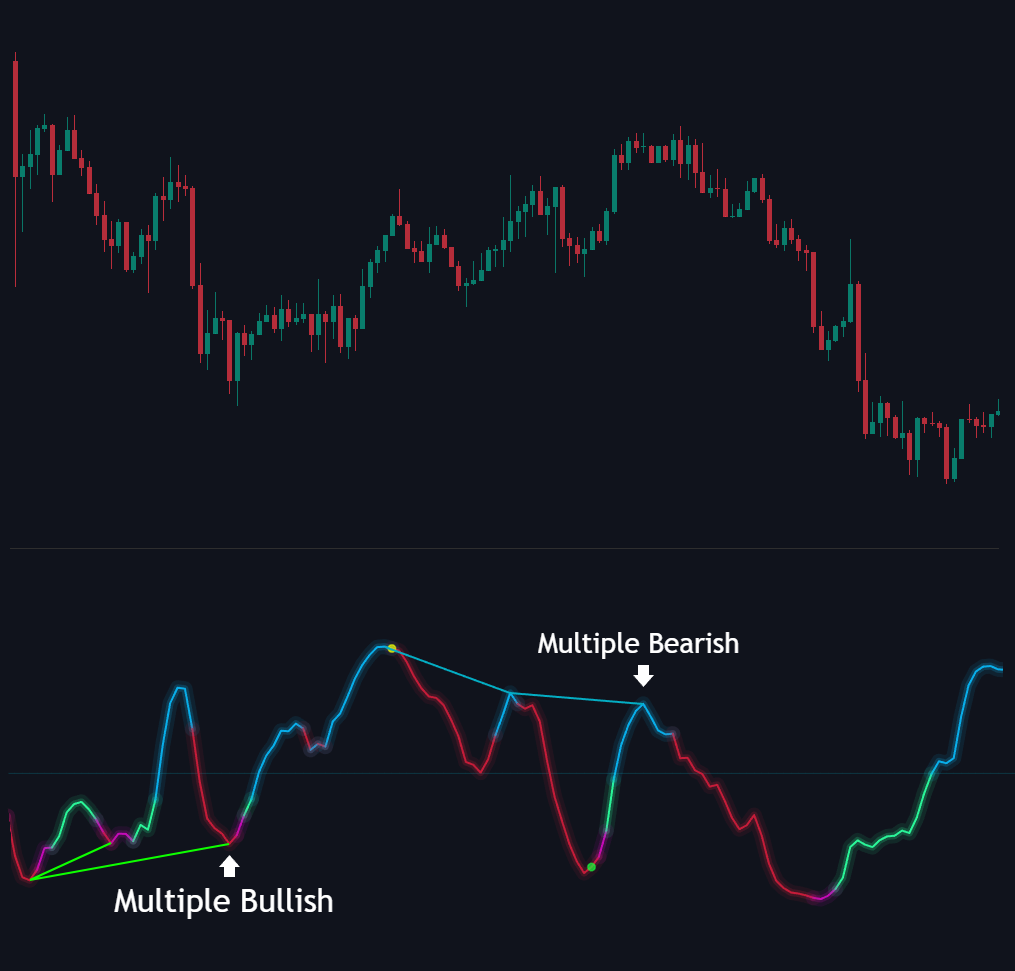<mark style="color:$info;">The</mark> <mark style="color:$info;"></mark><mark style="color:$info;">**Divergence Detection**</mark> <mark style="color:$info;"></mark><mark style="color:$info;">feature enhances the oscillator’s predictive capabilities by identifying areas where momentum diverges from price movement, which often signals reversals:</mark>