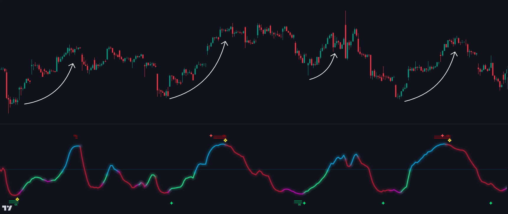 * <mark style="color:$info;">**Purple**</mark><mark style="color:$info;">: Signals a transition in momentum from downward to upward. It indicates a shift in market dynamics.</mark>