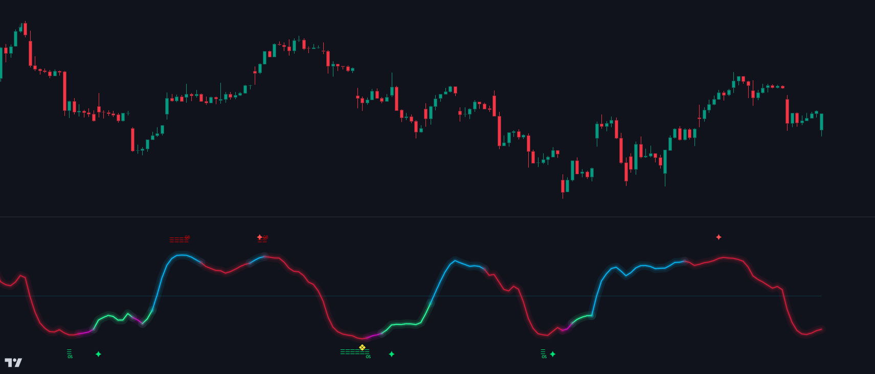 * <mark style="color:$info;">**Red**</mark><mark style="color:$info;">: Reflects overbought or oversold conditions with declining momentum, often signaling a potential reversal or slowdown.</mark>