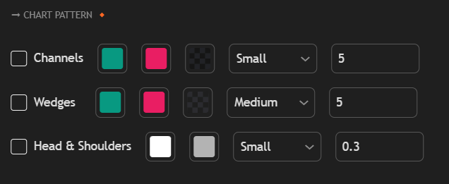 <mark style="color:$info;">This section provides full control over the detection and visualization of chart patterns, including</mark> <mark style="color:$info;"></mark><mark style="color:$info;">**Channels**</mark><mark style="color:$info;">,</mark> <mark style="color:$info;"></mark><mark style="color:$info;">**Wedges**</mark><mark style="color:$info;">, and</mark> <mark style="color:$info;"></mark><mark style="color:$info;">**Head & Shoulders**</mark><mark style="color:$info;">. Each pattern type has its own toggle and configuration options.</mark>