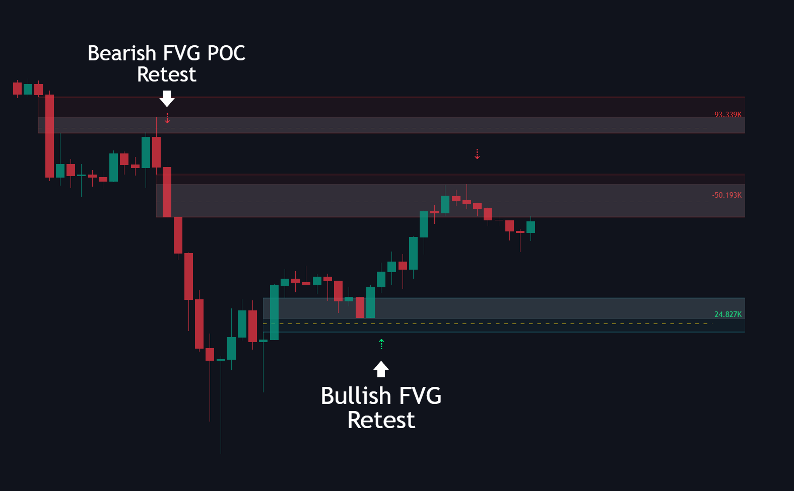 {% hint style="info" %} <mark style="color:$info;">PoC lines help detect retest signals by marking the most responsive price inside the FVG — either the mean level or the highest-volume price.</mark>